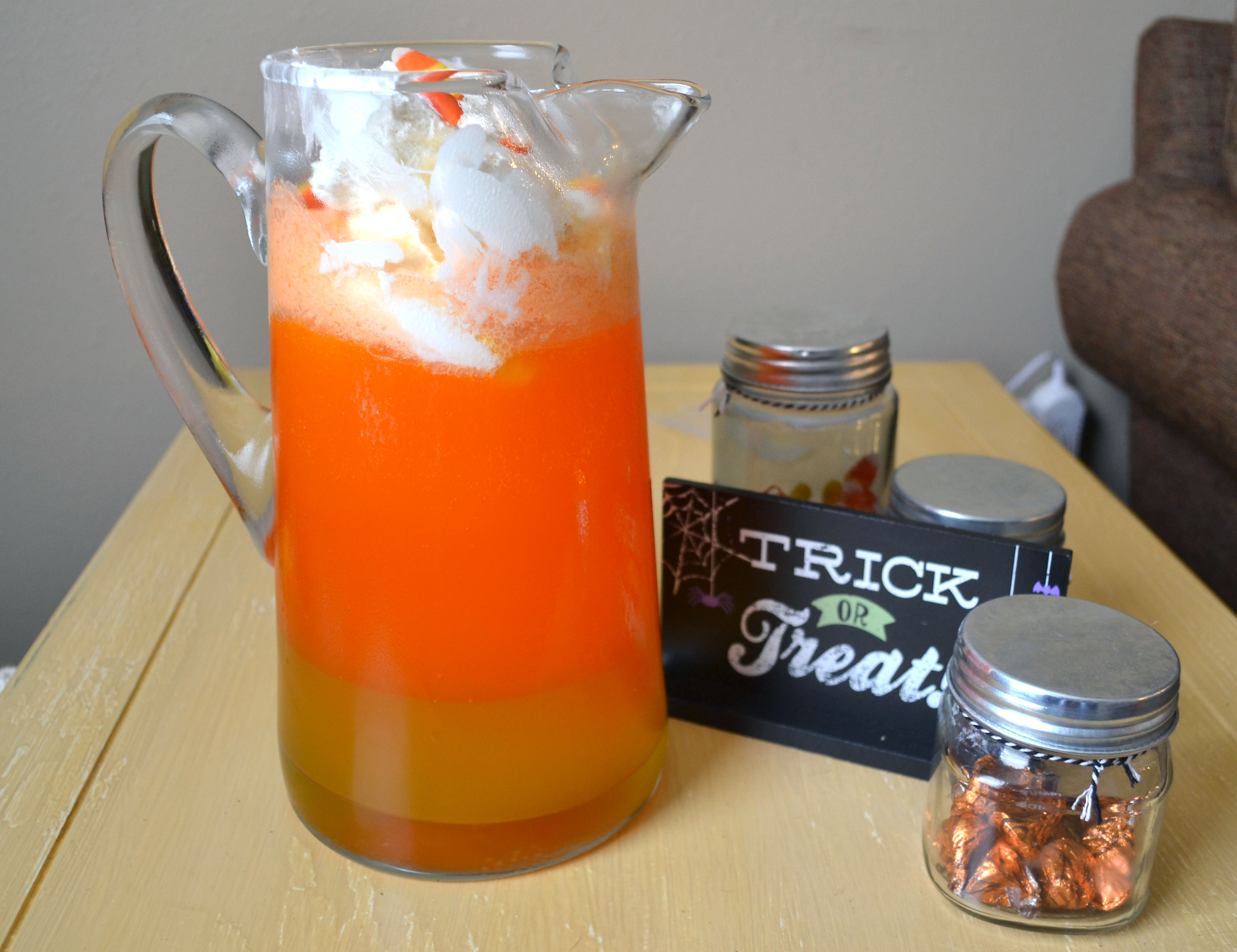 A candy corn punch that is kid friendly is sure to stand out as a great centerpiece at a Halloween party. With only four ingredients, you can whip up a pitcher the night before or even the day of your event. You will need: